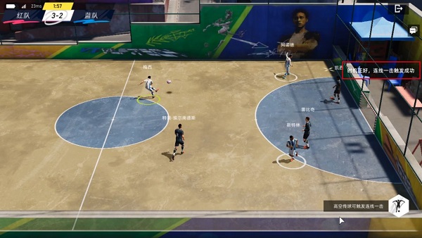 街球-连线一击是街头足球比赛内新增的一种操作方式。通过进球、传球、铲断等行为来积攒能量值,能量值满后,通过高空传球的方式传球给处在进攻位置的队友来实现发起连线一击,接传球的队友则会根据接球的时机自动触发射门。
