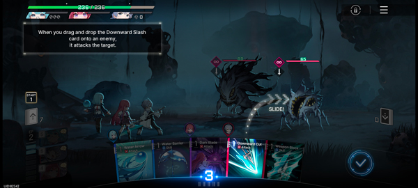 6、游戏开始前会有个新手教程,玩家需跟随引导抽取卡牌,然后选择敌人进行攻击,完成新手教程后即可正式开始游戏。