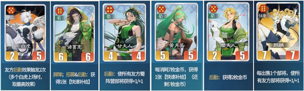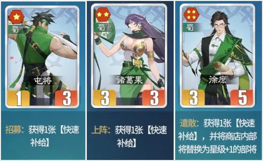 蜀卒:低配甘夫人,很好用,稳定触发左右2个羁绊,3本前必拿,4本不建议拿。